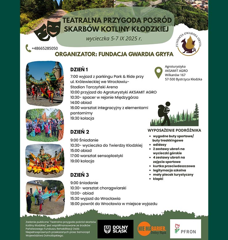 Projekt „Teatralna przygoda pośród skarbów Kotliny Kłodzkiej” odbył się w dniach 5-7 września 2025 roku i był wyjątkowym trzydniowym wyjazdem w okolice Międzygórza dla grupy młodych osób z niepełnosprawnością z Wrocławia i powiatu wrocławskiego. To wydarzenie było kontynuacją poprzedniego projektu „Artystyczne spotkanie na styku dwóch górskich krain”, który spotkał się z ogromnym entuzjazmem uczestników. Już wcześniej zgłaszali oni potrzebę kolejnej wspólnej wyprawy – i tak powstała idea tej teatralno–rekreacyjnej przygody.